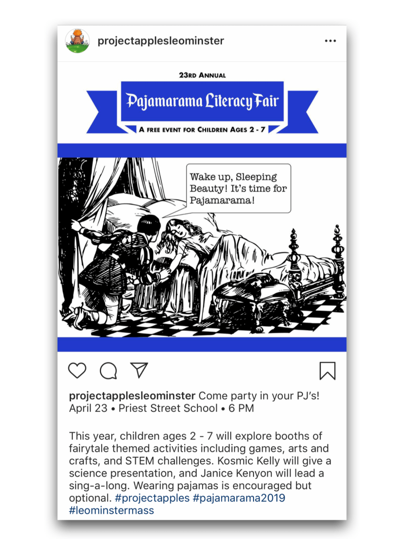 My goals for the Instagram post were to communicate the theme of Pajamarama and to catch the reader’s eye. I included the same blue banner that I used in other marketing materials for branding consistency. I utilized the caption to provide further details about the event.